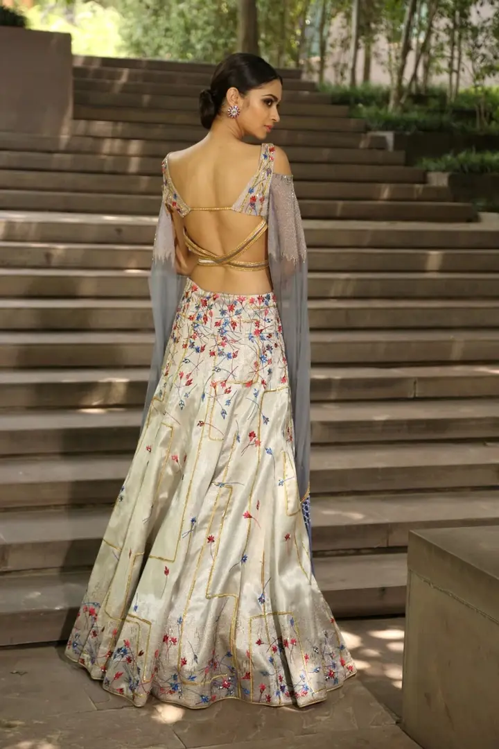 Off-White Multicolor Thread Embroidered Blouse & Lehenga Set